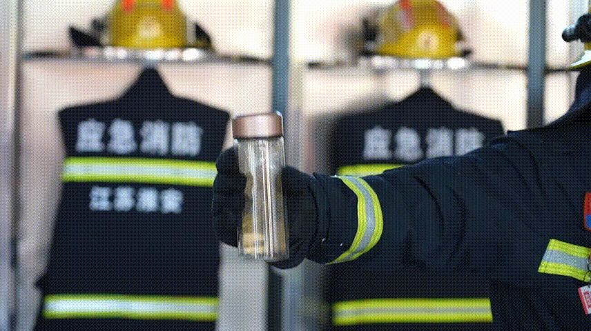 消防员在保温杯内倒入热水,加入红枣、枸杞。摇晃一段时间后,保温杯内有大量小气泡产生。